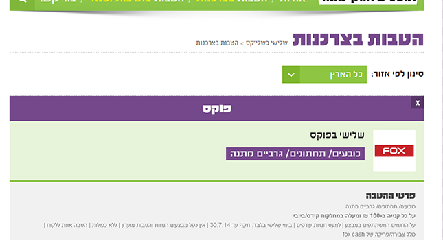 גולת הכותרת של ההטבות מגיעה, ללא ספק, לקניוני עזריאלי שמציעים "בנוסף להטבות", בכל שבוע, "פעילויות שונות ב-2 קניונים מתחלפים". המידע החסר בפרסום הזה הוא, כמובן, מהם אותן הנחות מסתוריות, וכן מועדיהן וטיבן של אותן הפעילויות.