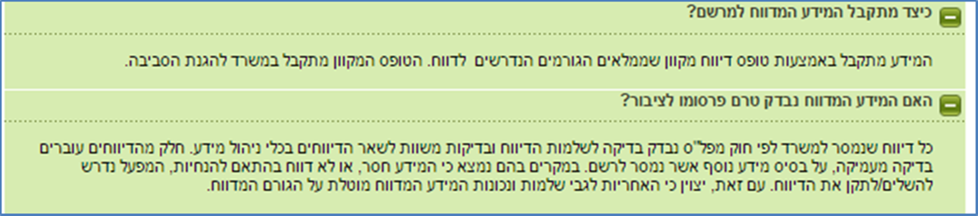 אכן, מטרות החוק חשובות וראויות ביותר. הן חשובות במיוחד לאור ההכרה וההבנה הגוברות והולכות של פעילי סביבה ומשרד הבריאות כאחד, באשר לסכנה הנשקפת מפליטה של חומרים רעילים מסוימים לאוויר או לקרקע. סכנה העלולה להוות מפגע בריאותי חמור לאדם הנחשף לה. האחריות על הדיווח נמצאת בידי המפעלים, כפי שרואים בתמונה שנלקחה מאתר המשרד להגנת הסביבה. במסגרת דיווח זה אמורות להירשם כל התקלות שגרמו לפליטת חומרים מסוכנים לסביבה, קטנות וגדולות כאחד.