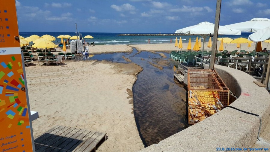 התמונות הללו צולמו ב- 23.8.2016 בחוף הרחצה הצמוד ל- "רויאל ביץ'" בתל-אביב-יפו. מבדיקות שנערכו התגלה שבנגר היה ריכוז גבוה של חיידקים המאפיינים ביוב אנושי. חשיפה לפתוגניים אלו עלולה לגרום לשלשולים וחום גבוה ביחוד אצל ילדים. מצער שחלק מחוויית הרחצה בחוף הים מלווה לעיטים בריחות קשים של ביוב וחשיפה אפשרית לחיידקים המסוכנים לבריאות האדם.